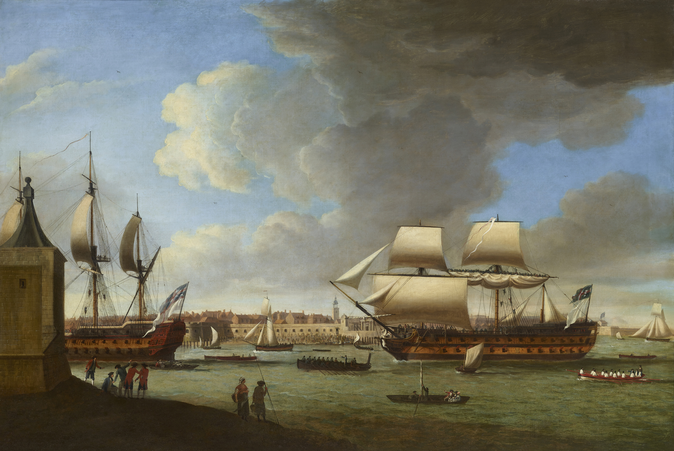 In his book, Dominic Serres, R.A., 1719-1793; War Artist to the Navy, Alan Russet writes on page 149 about an earlier, un-exhibited painting of the same subject produced in 1782 which measures 30 x 44 inches. This painting is now in the collection of the Art Gallery of South Australia. He states that: “The return to Portsmouth with a ship-of-the-line as a prize was an occasion for great celebration. Serres does full justice to the occasion by bringing the subject close to the picture plane, clearly showing the figurehead, and animating the scene with foreground figures. Serres’s second son, Dominique Michael, served briefly as an Able Seaman on Foudroyant during the summer of 1782.”